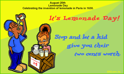 August 20th Lemonade Day Celebrating the invention of lemonade in Paris in 1620. It's Lemonade Day! Stop and let a kid give you their two-cents worth.